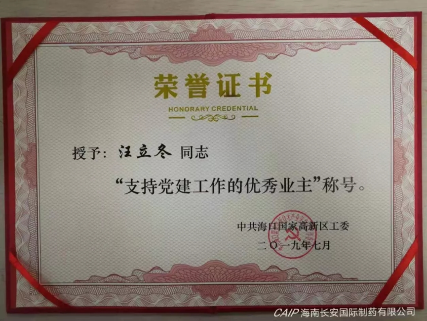 為表彰先進(jìn),弘揚(yáng)正氣,中共??趪腋咝聟^(qū)工委分別授予海南長安國際制藥有限公司黨支部書記汪立冬和黨支部委員陳麗娟“支持黨建工作的優(yōu)秀業(yè)主”和“優(yōu)秀黨務(wù)工作者”稱號(hào)。