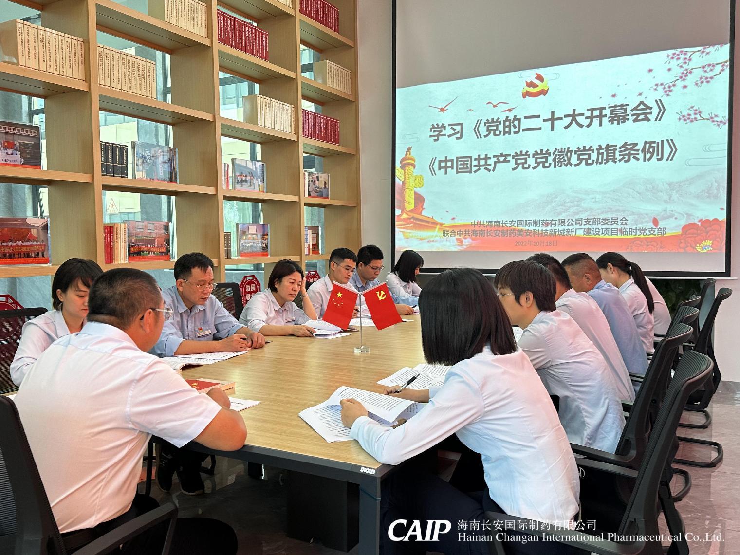 10月18日長安制藥黨支部聯合長安制藥美安科技新城新廠建設項目臨時黨支部,在美安廠區黨建會議室開展黨支部書記上黨課,學習《黨的二十大開幕會報告內容》 及《中國共產黨黨徽黨旗條例》。