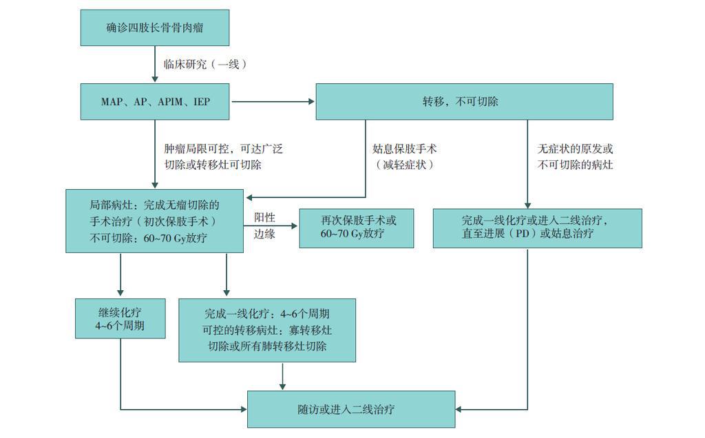 保肢治療指經典型骨肉瘤在多學科團隊醫生共同努力下完成的新輔助化療、保肢手術和輔助化療等一系列治療總稱,其目的是在提高患者生存率的前提下,減少局部復發、盡量保留良好的肢體功能。肢體經典型骨肉瘤保肢治療方法如下圖所示:
